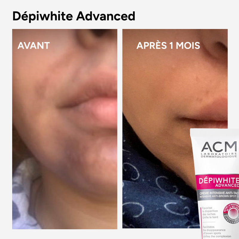 « Dépiwhite Advanced m'a beaucoup aidé. Ma peau a brulé après un peeling. Mon dermatologue m'a prescrit votre produit et après 1 mois, mes taches ont disparu. »